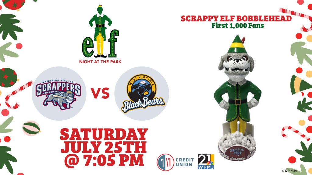 The Mahoning Valley Scrappers are excited to announce a special ELF™ Scrappy bobblehead giveaway on Saturday, July 25 at 7 17 Credit Union Field at Eastwood presented by 7 17 Credit Union and 21 WFMJ. The Scrappers will take on the West Virginia Black Bears at 7:05pm.